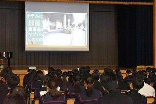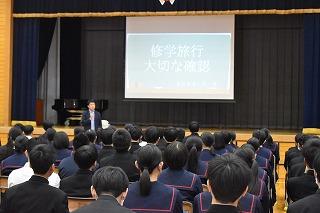 本日6限目、3年生は、いよいよ来週14日(火)に迫った修学旅行の学年集会を行いました。学年主任の谷口先生のプレゼンと一人一人に手渡されたしおりで、行程に沿いながら留意すべきポイント等について確認していきました。やはり修学旅行は、中学生時代を振り返った時に思い出に残るイベントの一つです。参加する皆さんは、まずは体調管理に十分努めて、当日を迎えられるようにしてくださいね。