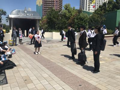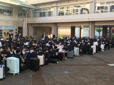 修学旅行もいよいよ最終日。朝の気温は17度くらい。日中も大きく気温は上がらない予報です。天気も大丈夫そうです。今日は、3年生の皆さんが一番(?)楽しみにしていたUSJです。