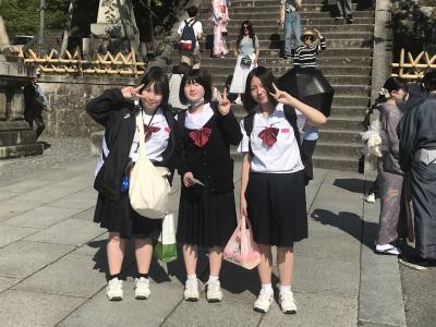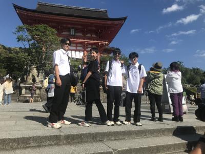 各グループ、それぞれのプランに従って自主プランを大いに満喫したようです。集合場所の清水寺に、みんな大満足の笑顔で到着しました。清水寺は修学旅行生と観光客で大混雑でした。お世話いただきましたタクシー運転手の皆様方、今日は本当にありがとうございました。各グループでの清水寺散策後、16時30分に宿泊ホテルに向けて出発します。