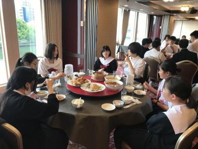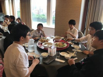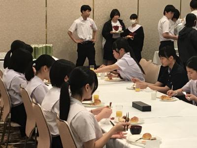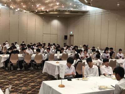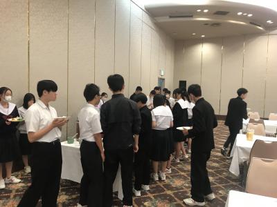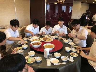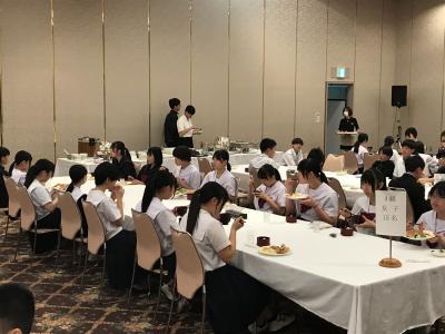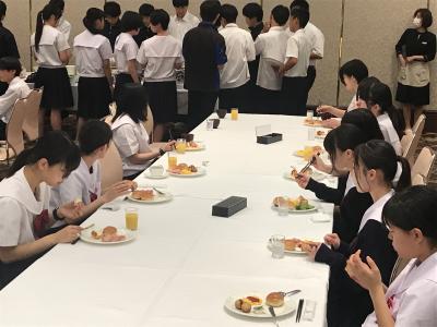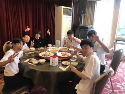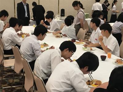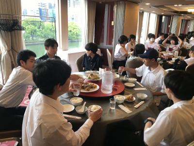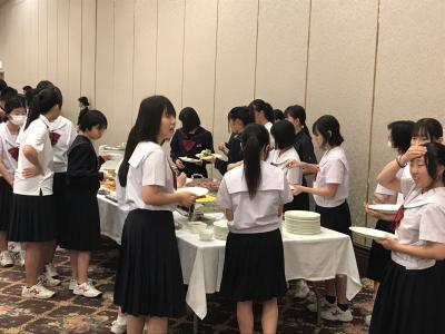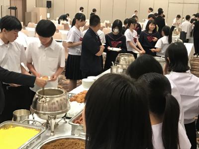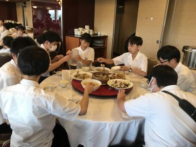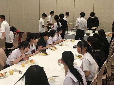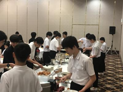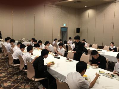 19時より夕食会場にて夕食。本日は洋食セットメニューです。みんな食欲旺盛、元気な様子で一安心です。今日は朝早くからの出発、そして暑い中での行動でした。夕食後の部屋内では、荷物の整理、しおりの記入、入浴を済ませてしっかり体を休めてください。1日目、生徒の皆さん、お疲れ様でした。先生方、添乗員の皆さん、バスの運転手さん、カメラマンさん、ありがとうございました。明日2日目もよろしくお願いします。