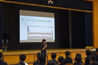 生徒会タイムは、給食委員会から「残量調査」の結果報告がありました。調理師、調理員、栄養職員の皆さんが、生徒の皆さんの栄養バランスを考え、栄養満点で美味しい給食を毎日作ってくれています。それぞれの適量をしっかりと食し、健康な体作りにつなげていきましょう。