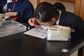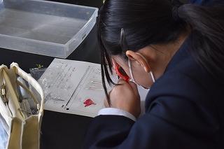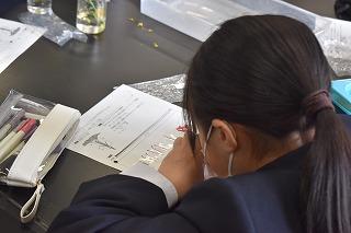 1年生理科の授業。「花のつくりにはどんな特徴があるのか」について調べていました。サツキとアブラナの花を外側からピンセットで丁寧に外し、テープで張り付け、枚数や本数、特徴など気が付いたことを書き込みました。「ひとつの特徴も見逃さないぞ」という気持ちが、みんなの真剣な顔から溢れていました。自ら学ぼうとする意欲が、学習したことが定着する大きな力となりますね。