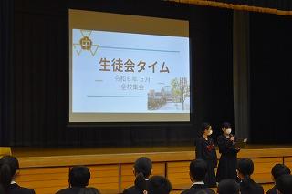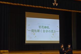 全校集会最後の生徒会タイムで、令和6年度の生徒会目標が発表されました。今年度は「百花繚乱ー個性輝く自分の花をー」です。生徒の皆さんからのアンケート結果等をもとに、先日の生徒議会で決定しました。一人一人が、安心してそれぞれの花(個性)を咲かせ、その個性を互いに認め合える学校を、みんなで力を合わせて創っていこうね。