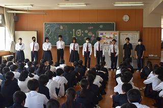 本日4限目、1年生は、後期スタートにあたっての学年集会を行いました。4月からスタートした中学校生活。達成できたことはさらに充実を目指し、学年の課題として見えてきたことは、一人一人がしっかりと意識し、課題解決に向かってください。さらに素敵な集団となり、新たな後輩を迎えてくれることを期待しています。