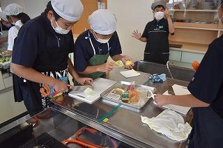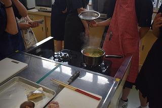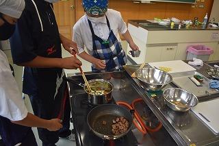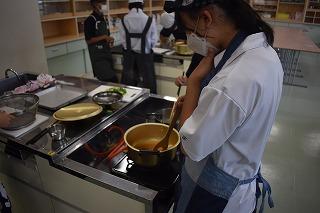 さて、1年生技術家庭科の家庭分野の授業では、現在調理実習に取り組んでいます。1年生は、5月の遠足でハヤシライス作りにチャレンジしました。遠足での調理過程を振り返り、より効率よく、よりおいしく調理できるよう改善点を話し合い、ハヤシライス、シチュー、カレーなどの調理実習に臨んでいます。今日は1組と2組の様子を参観しましたが、野菜等を刻む包丁さばきが素晴らしい人が何人もいて感心するとともに、調理室はおいしそうなにおいでいっぱいでした。