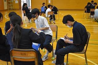 2年生英語科の授業。「話すこと」のパフォーマンステストを行っていました。アンジェロ先生に、自分の旅行プランを伝え、アンジェロ先生からの質問に答えました。何人かのテストの様子を参観しましたが、どの人も適切に自分たちのプランを伝えられていましたよ。