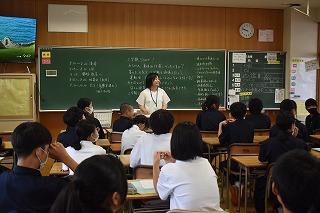1年生英語科の授業。今日は、夏休みの思い出を伝え合うようです。授業にお邪魔したときは、アンジェロ先生が自身の夏の思い出を伝えているところでした。生徒の皆さんは、グループで机を合わせ、アンジェロ先生の夏の思い出をメモを取りながら聞き、グループで情報共有、全体での確認と進みました。この夏、アンジェロ先生は上谷先生と一緒に白山に登ったのですね。