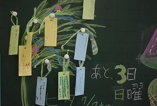 しらとり学級の後ろ黒板に、クラスの仲間、担任の先生の願い事が書かれた短冊が飾られています。皆さんの願い事がかないますように。来年は、本物の笹を用意しますね。このクラスには、絵を描いたり物作りが好きな子がおり、月ごとや季節に合わせて、黒板を彩ってくれています。