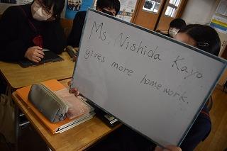 2年生英語科の授業。現在、比較表現(比較級・最上級)を学習中。今日は、①Who gives more homework? ②Who is more strict?などの質問に対し、選択肢(2年の先生方+アンジェロ)のうち、最も多い回答を予想し、比較表現を使って回答しました。アクティビティを楽しみながらも、どのグループも比較表現を適切に使いながら答えている様子に大変感心しました。ちなみに①、②の予想は、Ms.〇〇shida 〇〇yoが圧倒的でした。I think / she always cares about her students.(私は思います / 彼女はいつも生徒のことを気にしている・大切にしている)皆さんもきっとそう感じているに違いありません。