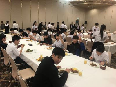 19時より夕食会場にて夕食。本日は洋食セットメニューです。みんな食欲旺盛、元気な様子で一安心です。今日は朝早くからの出発、そして暑い中での行動でした。夕食後の部屋内では、荷物の整理、しおりの記入、入浴を済ませてしっかり体を休めてください。1日目、生徒の皆さん、お疲れ様でした。先生方、添乗員の皆さん、バスの運転手さん、カメラマンさん、ありがとうございました。明日2日目もよろしくお願いします。