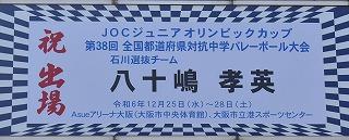 本校の八十嶋孝英さんが、石川県選抜チームの一員として、JOCジュニアオリンピックカップ 第38回全国都道府県対抗中学バレーボール大会に出場します。出場を祝して、応援幕を生徒玄関前に掲示しました。大会は、12月25日から28日にかけて大阪市で開催されます。現在、平日の一日と週末は、全国大会に向けて練習に励んでいます。大会での活躍を大いに期待しています。