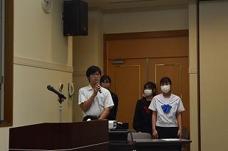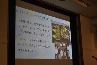 続いて、派遣中学生代表発表がありました。本校からは、川田敦己さん(3年)と飯室葵泉さん(3年)が、津幡南中の2名と一緒に、発表してくれました。日程・概要、ホームステイ、学校生活や授業、オーストラリアの文化、今回の事業で学んだことについて、大変わかりやすく伝えてくれました。