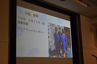 矢田富郎津幡町長のご挨拶に続き、今回団長として引率いただいた北山学校教育課長の事業概要報告がありました。続いて、派遣教員報告がありました。派遣教員の津幡南中学校田村教諭、津幡中学校田中主幹教諭を代表して、田村教諭より報告いただきました。