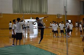 2年生保健体育科の授業。陸上競技の走高跳びにチャレンジ中。ここ数日は雨模様の天候が続いているので、今日は室内で練習。それぞれチャレンジする高さは違いますが、腕と足の振り上げや振り上げた足を素早く着地体制に整えるなど、大切なポイントを意識したジャンプがたくさん見られました。
