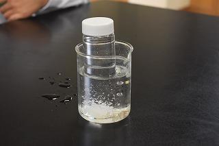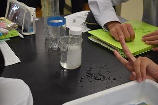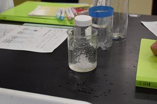 1年生理科の授業。現在、溶解度について学習中。今日は、溶ける量と温度にはどんな関係があるか調べていました。一度溶けたものが、温度を下げることで、再びその姿を現す様子をじっと見つめていました。