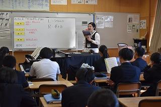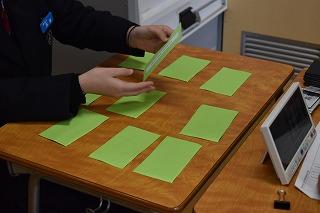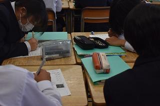 2年生英語科の授業。「話すこと【やりとり】」のパフォーマンステストを実施していました。目の前のカードを1枚選択。そこに記載されているトピックについて、アンジェロ先生とやりとりしました。トピックは、スクールルール、日本のマナー、将来やりたいこと、職場体験のことなど様々でした。やはりパフォーマンステストは少し緊張しますね。でも、トピックについてアンジェロ先生がした質問は、今までに習った表現で十分答えられますね。have to~、 want to be~、 want to do、 I went to ~ などなど。上手に答えられなかったというところを、今日のうちに確認しておくと自分の力になりますね。