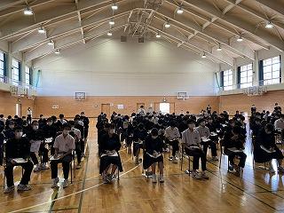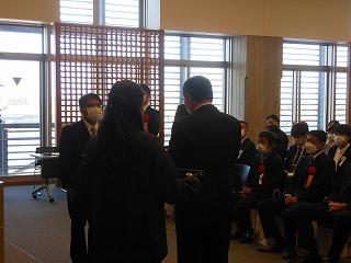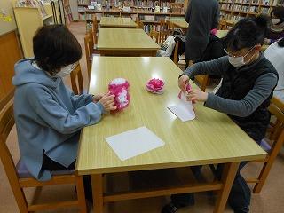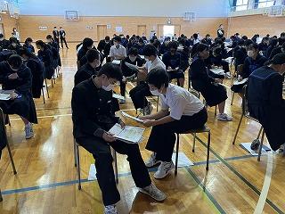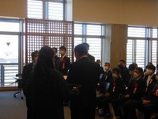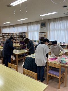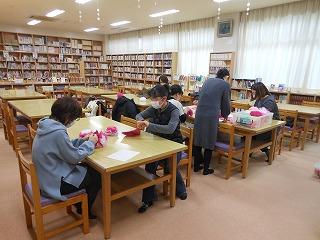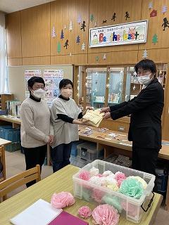 今日は午後から図書ボランティアの皆さんにご来校いただき、卒業バージョンの飾りつけの準備をしていただきました。また、事前に家庭で作成いただいた合格祈願お守りの贈呈式も行いました。3年生進路担当の菊田先生が受け取り、明日3年生全員に渡す予定です。3年生、楽しみにしていてくださいね。