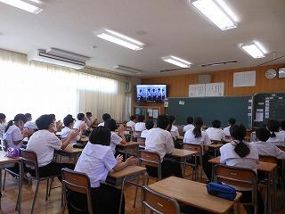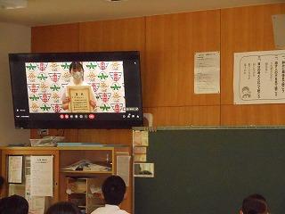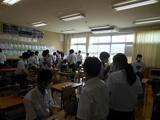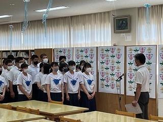 今日も大変暑く、短い時間とはいえ、集合型の集会をやめ、各教室でのリモート集会としました。表彰披露に続いて、永井校長先生のお話、茶谷先生のお話を聞き、最後に北信越大会・全国大会・北陸吹奏楽コンクールの壮行会を実施しました。明日から北信越大会が始まります。詳細は今日配付した「県体・県吹奏楽コンクール結果及び上位大会等のお知らせ」をご覧ください。