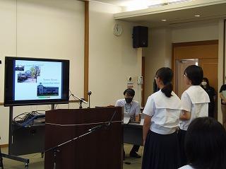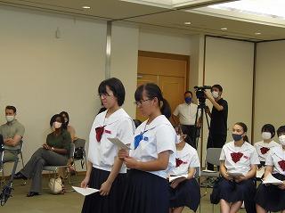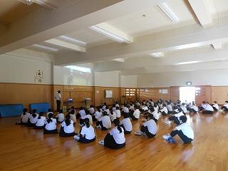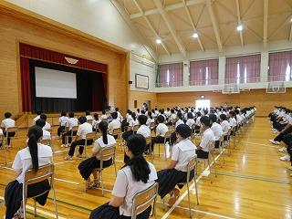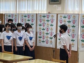 引き続きの全校集会では、茶谷先生の生活面のお話、岡本先生の学習面のお話を聞き、生徒会タイムに移りました。体育委員長の泉さんからは、蒸し暑い日もありますが、体育の授業でのベル学を意識する取組の呼びかけがありました。最後に後期生徒会役員選挙の公示です。立候補受付期間は今週中です。