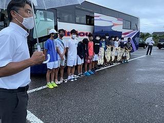 今日から3日間の日程で、北信越中学校総合競技大会が富山県内各地で開催されます。1日目の今日は男子ソフトテニス団体と女子陸上競技の2競技で本校の選手が出場します。先ほど男子ソフトテニス部が出発しました。
