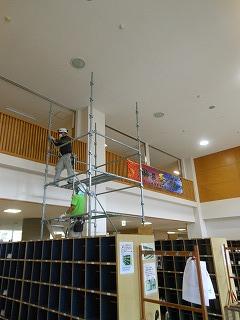 これまでは8つの照明のうち、3つが切れており、暗い状態でした。今回の修理を機にLED照明に変えます。26日の登校時には明るい状態になっています。