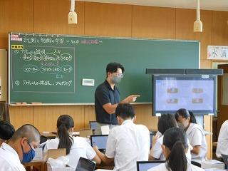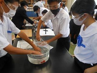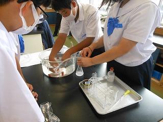 今日1限目は金沢教育事務所の先生をお迎えして、理科の研究授業を行いました。化学分野で「違う方法で発生させた気体は同じだろうか」を課題に、実験をして、発生した気体が酸素か二酸化炭素かを確認していました。