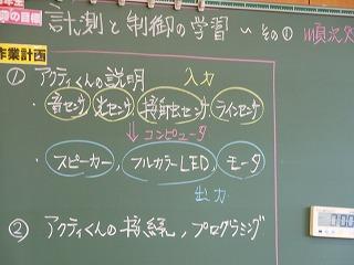 3年生技術では自動制御ロボット「アクティくん」を使って、プログラミング学習に取り組み始めました。色付きランプをつけるプログラムのほか、実際に走行させるプログラムを作り、2学期末にはモデルコースを走らせます。早くゴールするために、どんなプログラムを組んでいくのでしょうか。楽しみな学習です。