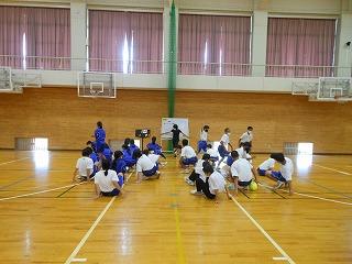 今日の5限目の1年3・4組保健体育は球技で3組が屋内のバレーボール、4組が屋外でソフトボールに取り組みました。3組は課題「お見合いを防ぐにはどうしたらよいか」を課題に声をかけあってゲームに臨んでいました。4組は今日で実習最終日を迎える木村先生がソフトボールの研究授業に臨みました。「相手に得点を与えないようにするにはどうすればよいか」を課題に生徒に意見を求め確認した後、実際にゲームに取り組みました。