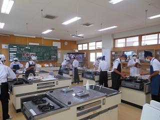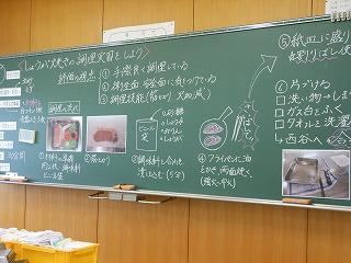 1年生の技術家庭は10月中旬に家庭を終え、技術になります。家庭科のまとめとして、感染対策に努めながら、一人調理を始めました。生徒たちは学んだことを実践にうつすチャンスです。黒板やモニタに映し出されるポイントを参考に、豚のしょうが焼き作りに取り組みました。