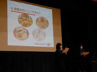 給食委員会では「調理員の1日」という動画を作成し、今日の給食時間に各教室で放送しました。材料を切ったり、混ぜ合わせたり、片づけの様子が字幕とともに紹介されました。