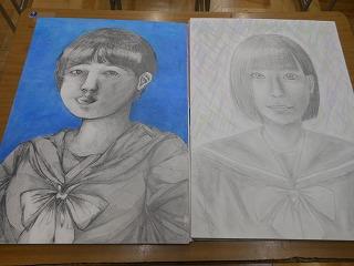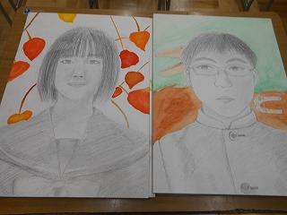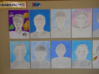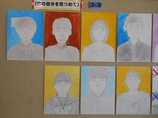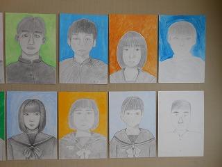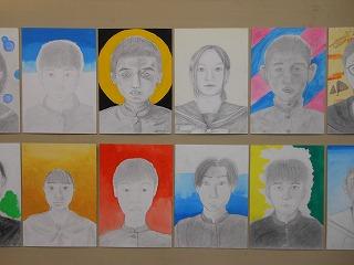 美術室の展示スペースは3年1組の生徒の自画像が飾られています。