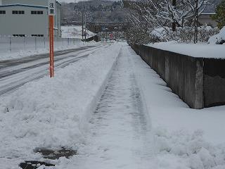 昨晩から10cm以上の積雪があり、学校前の歩道も歩きにくい状況です。生徒の皆さんの登校に合わせて、生徒指導担当の茶谷先生が6時30分から除雪機で除雪をしてくれています。南中条西の交差点から学校前は歩きやすい状態です。