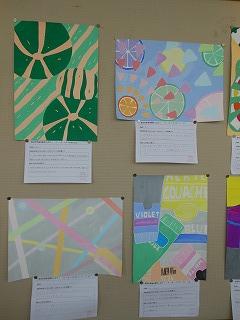 全学年で取り組んだ美術作品が随時展示されています。級友や先輩・後輩の作品を見ながら、こんな工夫もできるんだと刺激を受けることができますね。