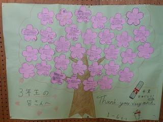 今朝登校した3年生は展示ホールの掲示物に注目。1年生203名から、3年生への卒業をお祝いするメッセージが「桜の木」となって登場しました。公立高校入試まで2週間を切った3年生はあと登校する日も今日を除いて4日となりましたね。(公立一般入試を受けない生徒はあと6日の登校です。)