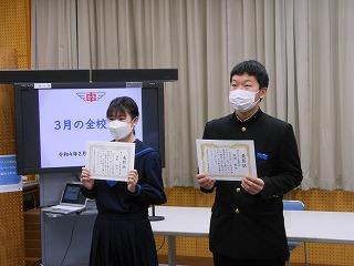 明日から3年生が臨時休校となるため、今日の1限目に3月の全校集会を実施しました。表彰披露では、3年生の小テスト(漢字・英単語)の1年間満点者・3年間満点者の表彰も行われました。
