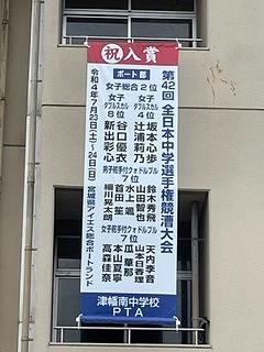 本校ボート部は先月末に行われた第42回全日本中学選手権競漕大会で女子総合2位という優秀な成績を収めました。PTAより、この健闘・入賞を讃えて懸垂幕をいただきました。ありがとうございました。
