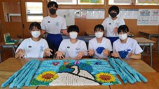 1学期最後の7月20日に全校生徒が作成した折り鶴を3年生の折り鶴委員の皆さんが組み合わせ、モニュメントにしてくれました。全校生徒が書いたいじめ撲滅や平和な世界を願うメッセージにあふれたモニュメントは9月1日の集会で披露され、9月8日に広島市に届けます。