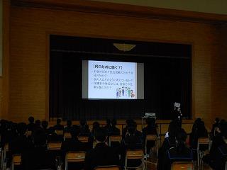 学校祭を終えて、1年生の進路学習が始まります。1年生は「働くこと」や「職業」について学びを深めます。まずは学年集会で桐田先生のお話を聞き、学級で働く意義について考え始めました。