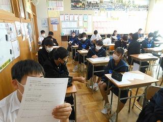今日は2学期期末テスト。午前3教科、午後2教科でテストを行いました。2学期の学習内容のまとめとあって、どの生徒も真剣に問題に向かっていました。