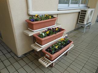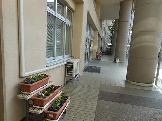 図書室に続いて、学校前のプランタも冬に模様替え。ヒャクニチソウからパンジーに変わりました。校務員の穴太さんが植え替えをしてくださいました。生徒達の登下校を見守る玄関の花々です。