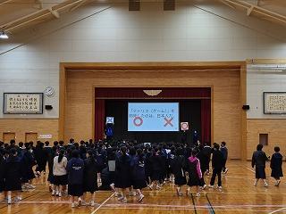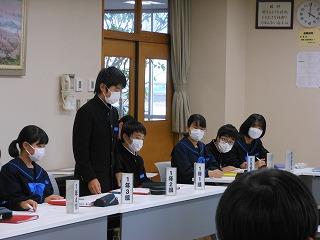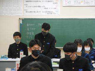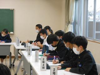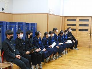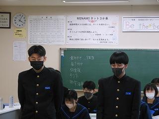 今日は放課後に後期第3回生徒議会を行いました。各委員会の報告に続いて、赤い羽根共同募金活動の結果報告、2月の生徒議会の予告がありました。意見交換では、給食後の歯みがきの様子や登下校中の態度、体育の着替えについて、意見があり、閉会の挨拶で青木生徒会長から各クラスで呼びかけることの確認を行いました。