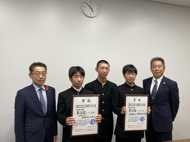 野球部の代表生徒3名が先週末に行われた第12回CBC全国大会・国際交流大会の第2位入賞を津幡町教育委員会の吉田教育長様、吉岡教育部長様、北山学校教育課長様に報告するため、昨日の放課後、津幡町役場を訪問しました。教育長様からは「この経験を活かして、冬場の練習にしっかりと取り組み、来年の夏につなげてほしい。」との激励の言葉をいただきました。