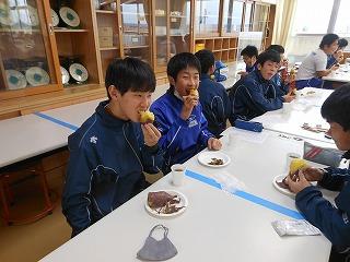 今日は冬至。給食も牛丼、ゆず風味の漬け物、れんこん団子汁に加えて、デザートに調理員さん手作りのかぼちゃのカップケーキです。牛丼を食べた後、みんなで美味しくいただきました。