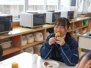 1年生は技術から家庭に切り替わって1ヶ月あまり。食に関する基本的な学習に続き、いよいよ調理実習が始まりました。挑戦するのは「蒸しパン」。プレーンのほかに、チョコチップやチーズなど、一人3種類の蒸しパン作りに取り組みました。クラスを前半後半に分け、大きなパーテーションを間にはさみ、一人調理で行っています。