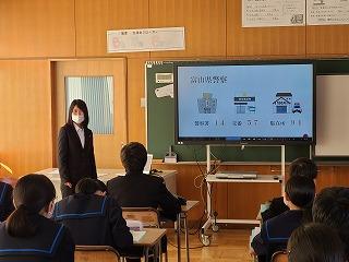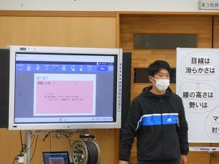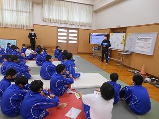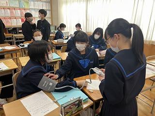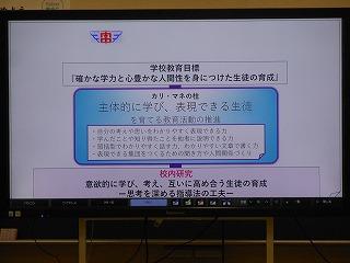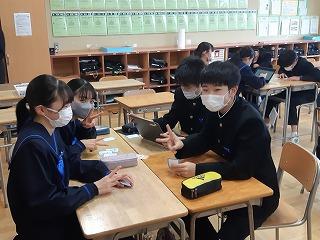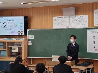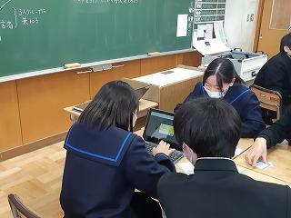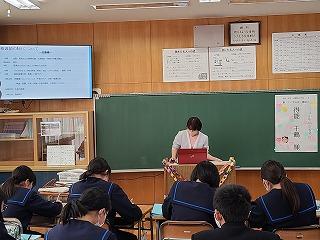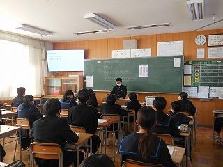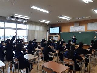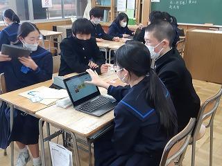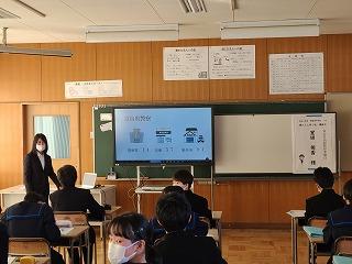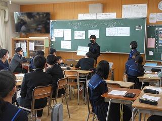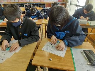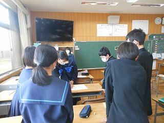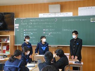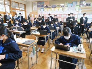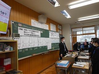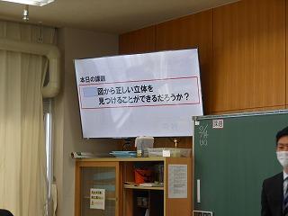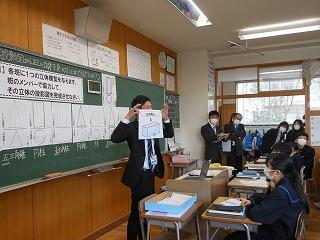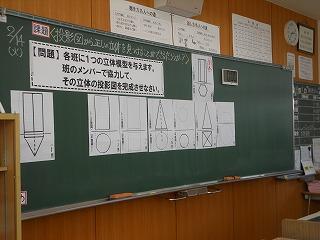 14日(火曜日)に石川県教育委員会の先生をお招きして、今年度最後の校内全体研修会を実施しました。1年5組の教室で本校研究主任の萬澤先生が空間図形の授業を行いました。「投影図から正しい立体を見つけることができるだろうか?」を課題にペア対話やグループ活動を行いながら、積極的に授業に取り組んでいました。