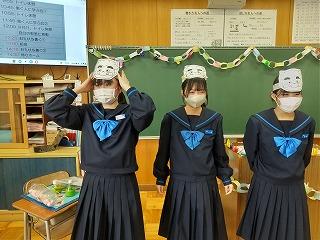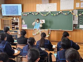 今日の給食の時間に、3年生の各クラス代表が運動会で同じ団だった1・2年生のクラスにメッセージを届けました。卒業を来週に控え、先輩として、1・2年生に伝えたいメッセージを一人ひとりがまとめました。