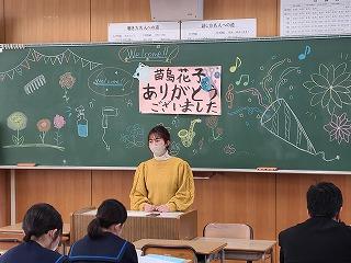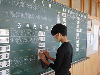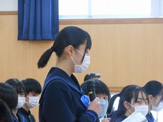 最後に生徒会タイムです。重点委員会の美化委員会から無言清掃の徹底について呼びかけがありました。また、選挙管理委員会より令和5年度前期生徒会役員選挙の公示されました。執行部からは水越さんが生徒会組織について、杉本くんが後期生徒総会について、全校生徒に説明をしました。