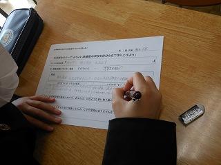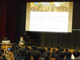 1年生では12名の講師の先生をお招きして、働く人に学ぶ会を行いました。生徒たちは6グループに分かれて、前半後半の2回、お話を聞きました。一人ひとりが役割を分担し、進行や記録、誘導、質問、お礼の言葉など、緊張しながらも立派に役目を果たしていました。また、実際に働いている方々のお話を直接お聞きすることで、来年度5月に実施する「職場体験学習」に向けても意欲が高まったようです。