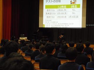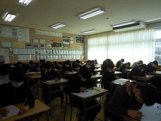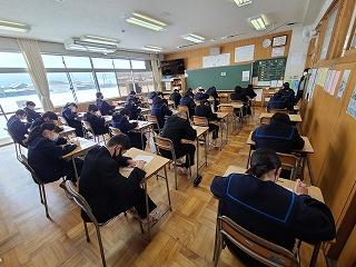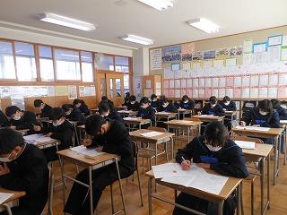 金曜日は1・2年生の3学期期末テストです。今日はそれに先立って、1年生は保健体育と家庭のテストを、2年生は技術のテストを行いました。3学期は定期テストが1回しかないため、期末テストで学習の成果を発揮できるよう、明日の祝日も大切に使いたいですね。