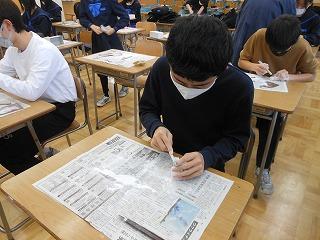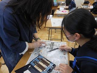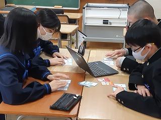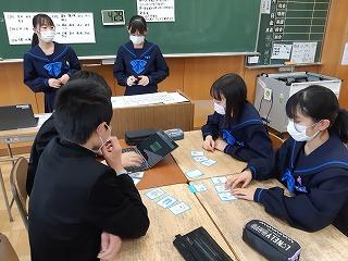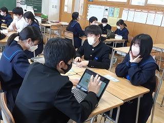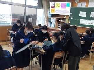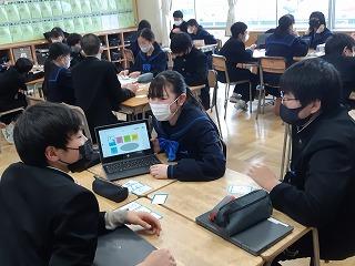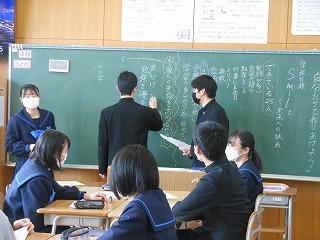 3年生の英語科では教科書の学習内容が終わり、これまでの復習プリントに取り組むことが多いのですが、ALTのクロエ先生が来られる時にはペアワークやグループ学習をしています。2組の英語では既習の熟語を使って、3~4人で文章を考える活動を行っていました。